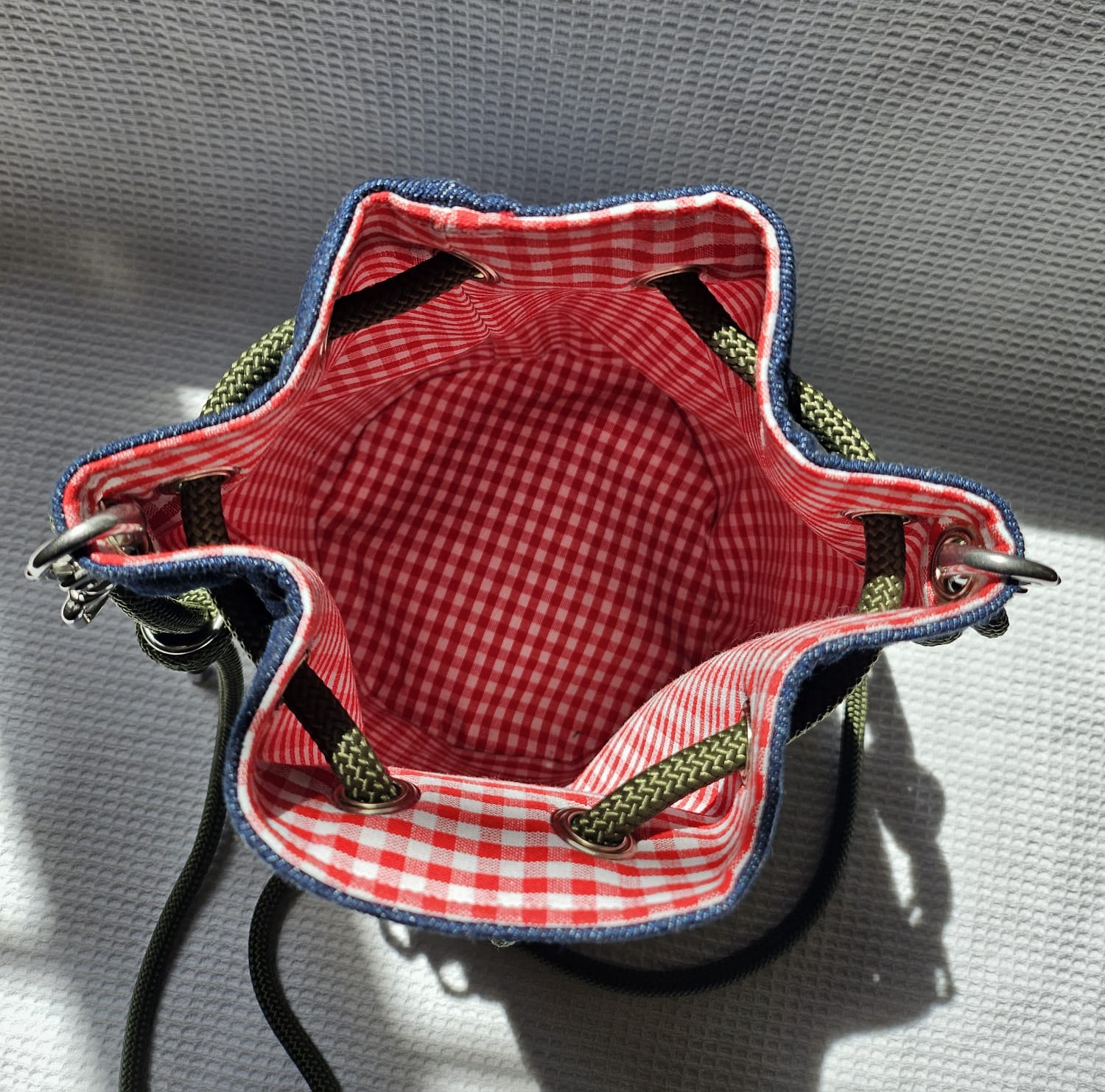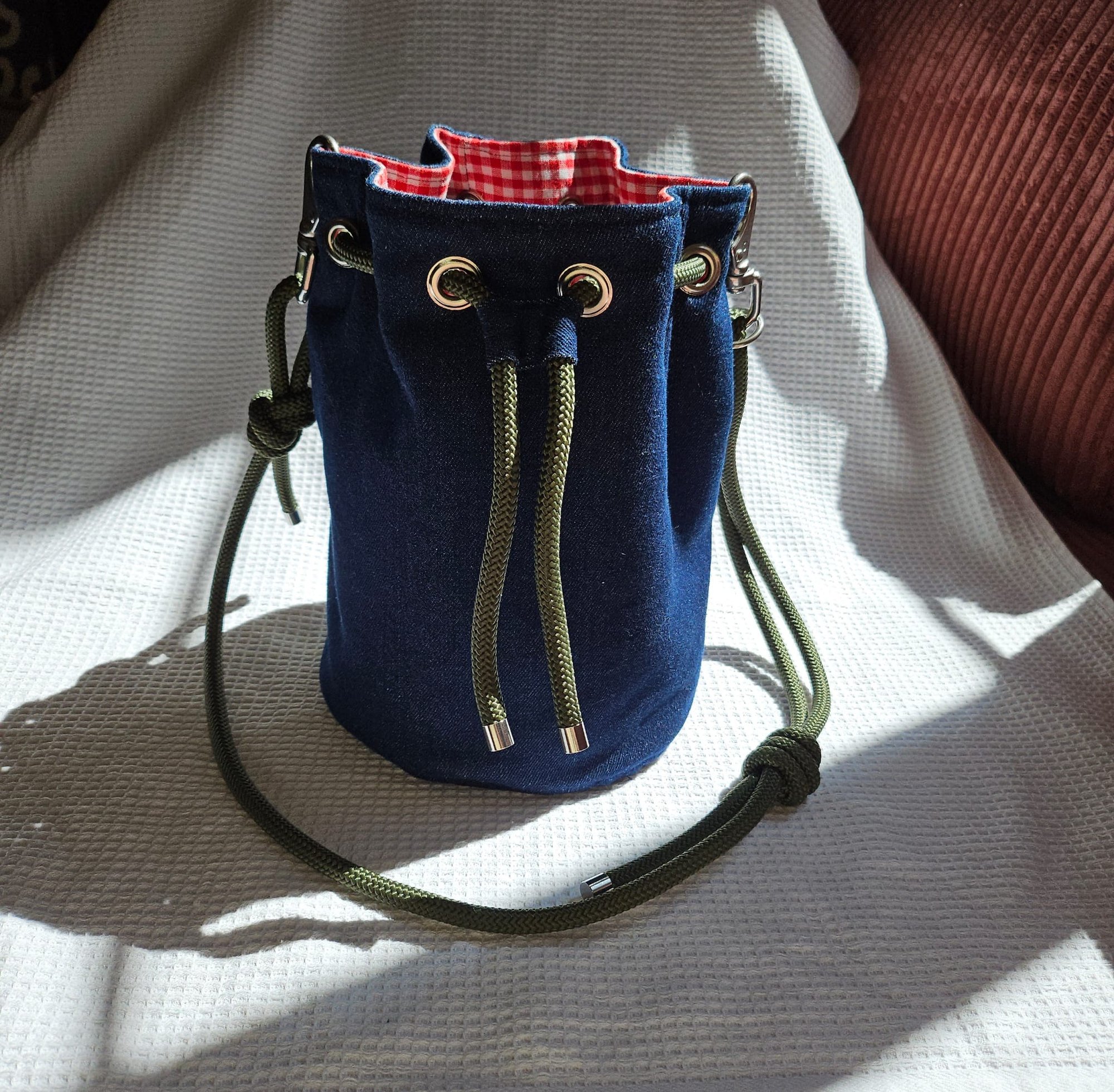 This handmade bucket bag combines style and practicality with a unique artisanal touch. Crafted from sturdy denim, it features a red gingham cotton lining that adds a warm, retro touch. The fabrics are Oeko-Tex certified.